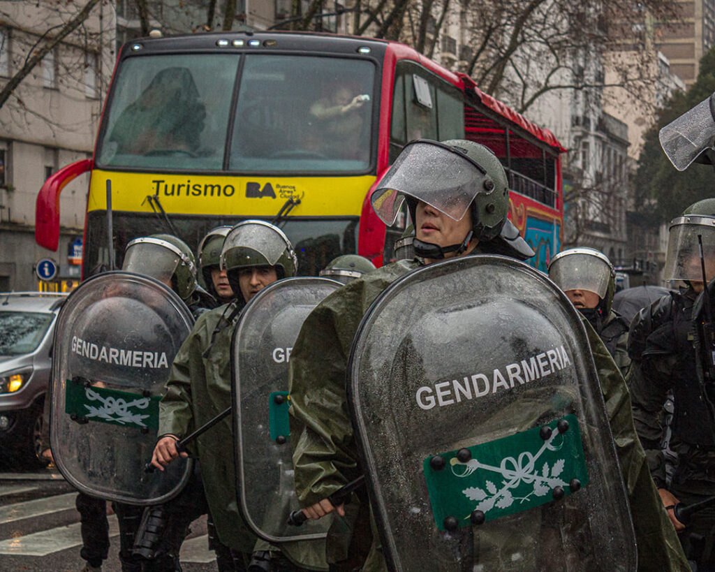 Según el protocolo revisado, las fuerzas de seguridad —incluidas aquellas cuyo mandato es proteger las fronteras de Argentina, como la gendarmería— pueden utilizar gases lacrimógenos, cañones de agua y balas de goma para impedir que la gente bloquee el tráfico.